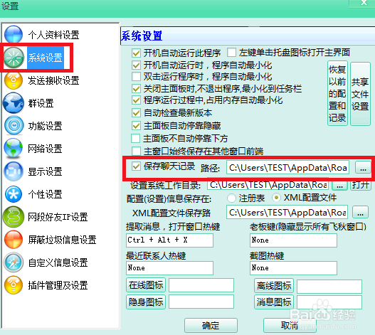2、在弹出的页面中,选择系统设置,查看保存聊天记录的路径,把路径复制下来,或是可以根据这个路径找过去