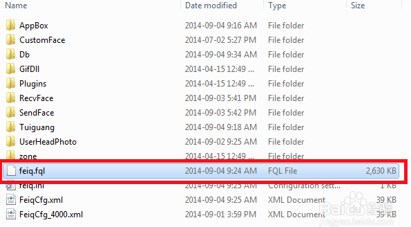 4、然后可以看到保存飞秋聊天记录的文件feiq.fql,只要把这个文件拷贝走,聊天记录就全在里面了