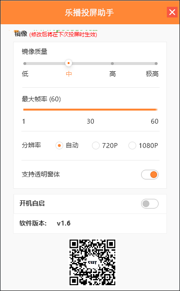 3、下图可以快速的对镜像质量进行设置、最大的帧率、分辨率、支持透明窗口、开机启动;