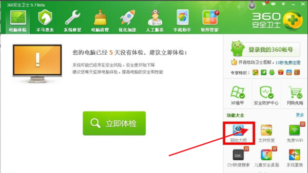 1、首先我们需要下载安装360驱动大师,安装完毕后打开软件会自动检测你的系统驱动情况。