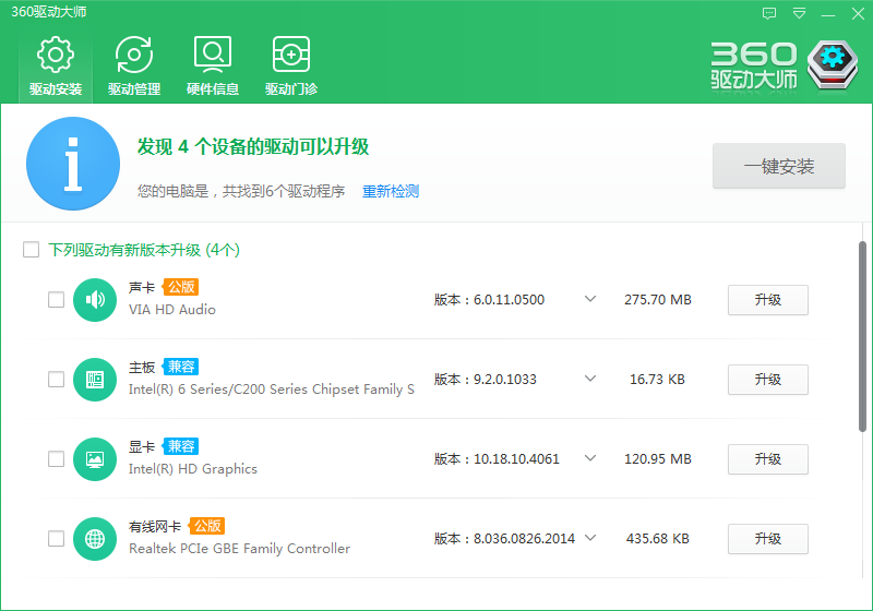 360驱动大师网卡版(集成万能网卡驱动)是一款能够安全有效的解决电脑驱动问题的软件,用户通过360驱动大师离线网卡版能够很直观的看到电脑驱动的运行状态以及更新情况,这样用户就不用再为电脑驱动运行异常而伤脑筋了。另外,该软件是网卡版所以用户在没有网络的情况下也能够进行驱动安装。