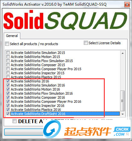 11、安装结束后,运行“_SolidSQUAD_”目录下的破解工具“SW2010-2016.Activator.GUI.SSQ.exe”,将其他默认项取消,然后勾选最下面和SOLIDWORKS 2016有关的所有项目,点击“Activate”