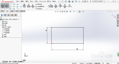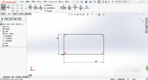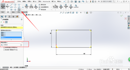 然后在前视基准面新建一个草图,绘制一个矩形,同时使用草图中的圆角,将矩形的四周圆角化,如图所示