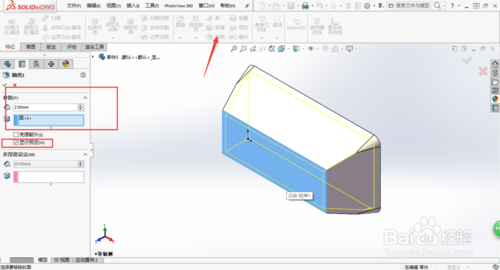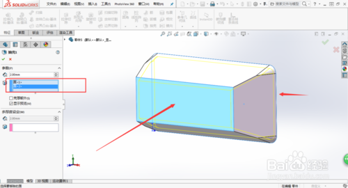 然后使用抽壳命令对实体进行抽壳操作,然后更改左侧的设置参数,使实体的壁厚为2mm,如图所示