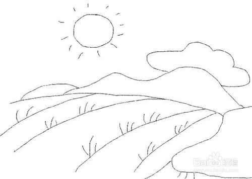 最后我们在天空中画出太阳,然后再画出云朵,这样我们的地面就画好了,如图所示: