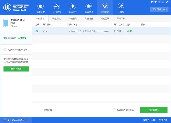 2、设备连接爱思助手,爱思助手会根据你的设备自动匹配可以刷的固件,如下图,我们选择“7、1、2”版本固件,在“连接成功自动激活设备”和“保留用户资料刷机”这两项都打勾后,点击“立即刷机”;