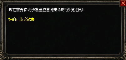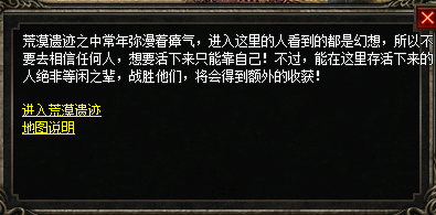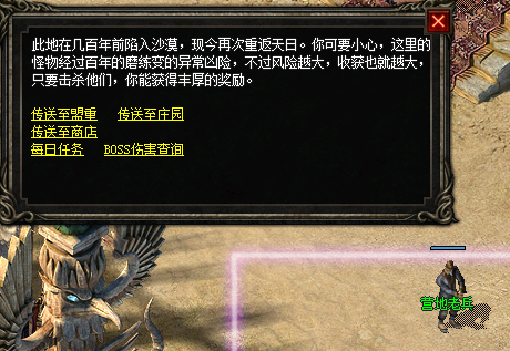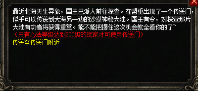 最近北海天生异象,国王已派人前往探查。在盟重出现了一个传送门,似乎可以传送到大海另一边的沙漠神秘大陆。国王有令,探查有功者将获得重赏。风险越大收获越大,你准备好了么!