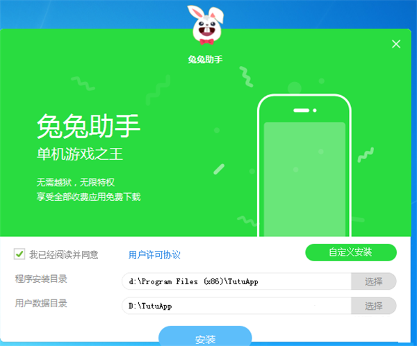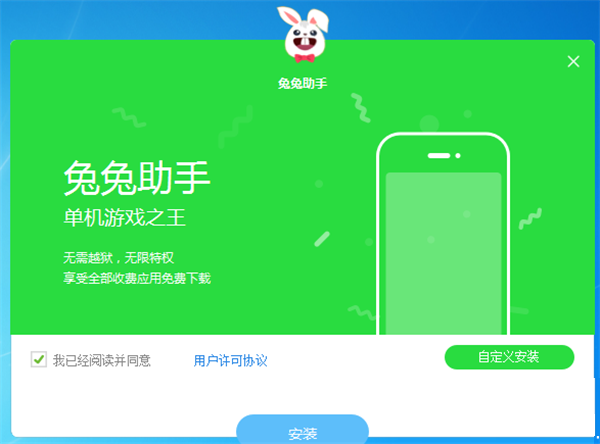 1、运行兔兔助手的安装程序,点击安装,即可进行安装,想修改安装路径,点击自定义安装。