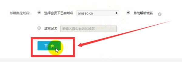 4.绑定邮箱域名,选择会员下已有域名,再点击下一步,如图所示。