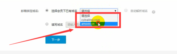2.绑定邮箱域名,选择会员下已有域名,再点击下一步,如图所示。