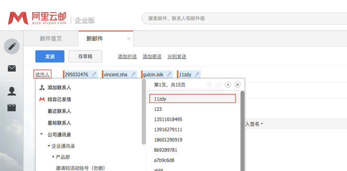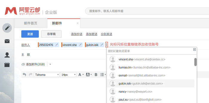 一、阿里邮箱企业版怎么群发邮件?阿里邮箱企业版群发邮件的方法1、编辑新邮件窗口,点击“收件人”地址栏,会出现常用收件人联想列表,同时也可以在输入框中直接手工输入添加多个联系人