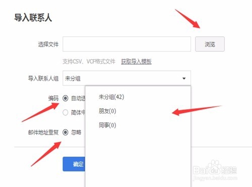 (1)选择文件:点击后面的“浏览”,找到上文中编辑好的通讯录文件。