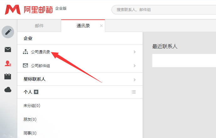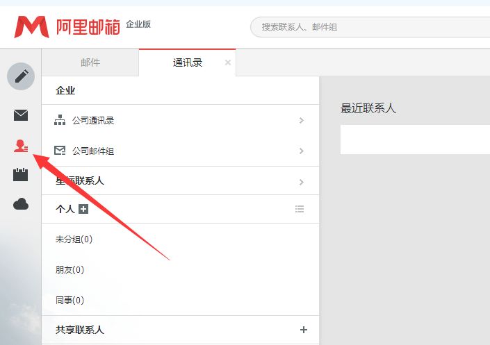 登录阿里企业邮箱后,点击位于左边中部位置的“通讯录”按钮,进入到通讯录界面。