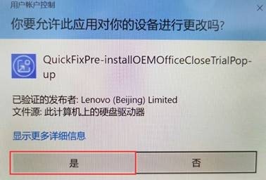 双击运行“预装OEM Office改变版本仍弹出试用窗口解决工具.EXE”,可能出现的用户账户控制提示,请选择“是