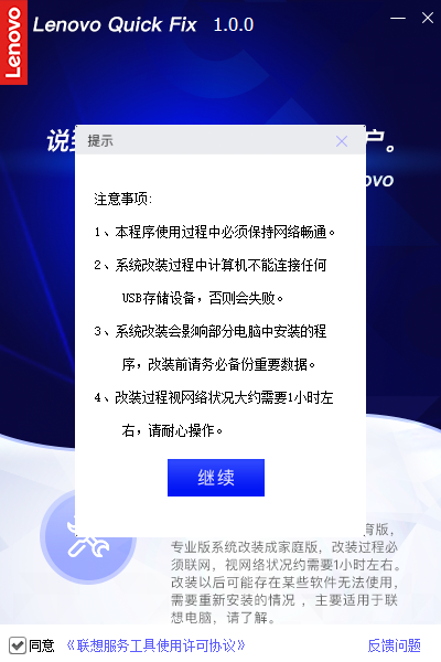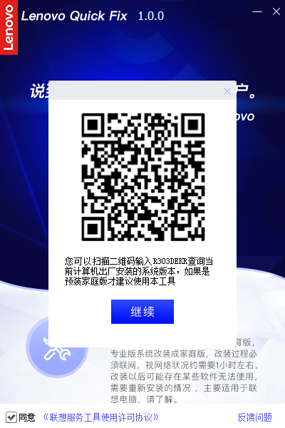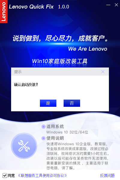 Lenovo Quick FixWin10家庭版改装工具是联想为自家用户推出的WIN10系统改版工具。使用该软件可以快速的将win10企业版、教育版、专业版修改为家庭版,操作简单,改装速度快,如果你需要把自己的win10系统修改为家庭版,这款软件一定能帮上忙。