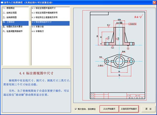 什么是"引导型"教程?就是软件通过闪动框、提示说明等,引导用户完成某个图形绘制。用户只需跟着软件提示、按软件要求点击鼠标或键盘就行,相当于老师手把手教您绘图。跟着软件做,不用考虑那些所谓"专业名词",多做几遍,想不会都难。该教程是目前最具创意、技术含量最高的自学帮助教程。与常见视频教程差别: