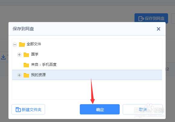 首先我们要把需要的文件勾上,再点击保存到我的百度云盘上。选择云盘里保存的位置,点击确定。