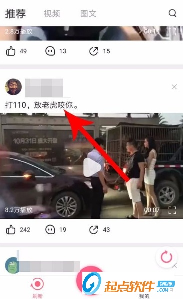我们首先打开皮皮虾,在默认的推荐页面找到想要配音的别人已发布视频,然后点击此视频上面的文字部分