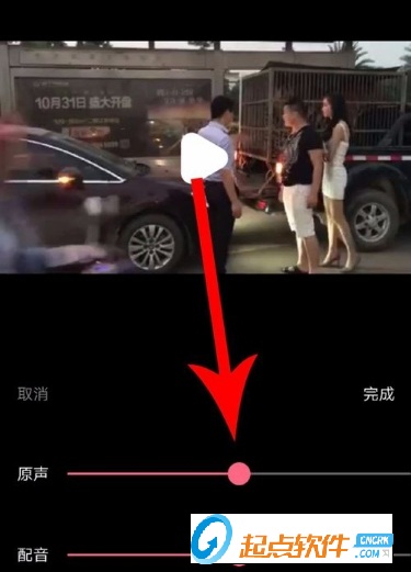 接着在底部弹窗中可以看到两条线,一个是原声,一个是配音,我们要做的事点击原声线上的滑块,拖动至最左端位置,这样原声就会被彻底关闭掉,然后点击“完成”退出声音控制界面