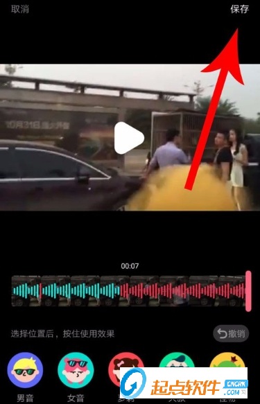 皮皮虾视频配音变声编辑完成后,点击右上角的“保存”按钮,接着点击新打开界面的“完成”按钮