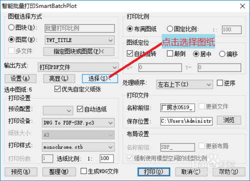 【5】选择指定的打印机,这里选择DWG TO PDF-SBP打印机,因为该打印机含有所需的纸张。