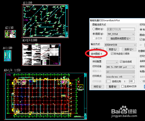 选择要打印的图纸,被选中的会亮显。可以看到例子里的图纸大大小小,尺寸和比例都不同。注意未注册时一次最多能选5张图纸。