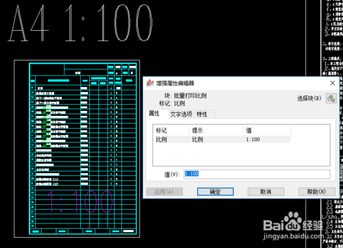 4.如果打印的图纸比例不同,需要智能识别时,需要在每一张图的范围内有增强属性块,标记包含有“比例”,内容设定为需打印的比例,这样插件就可以识别设计的图纸比例了。