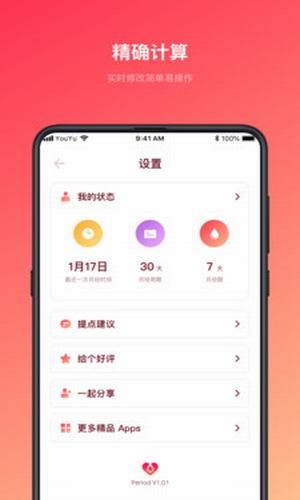 * 查看简单清晰的图表数据,分析您的经期、经期长度的信息。