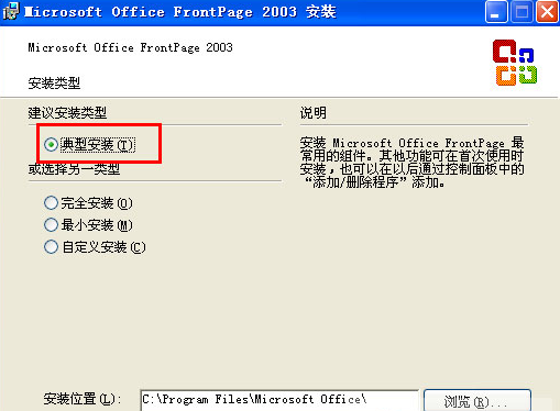 4、选择FrontPage 2003安装类型,选择“典型安装”就可以了。您可以点击下一步,软件会默认安装。或者您可以点击【浏览】选项,自己选择FrontPage 2003安装位置,选择完后点击【下一步】即可。