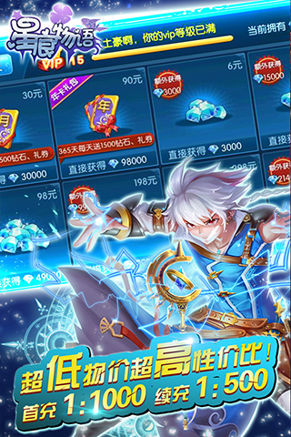 1充值比例1:500,首充双倍 超低物价超高性价比!2免费赠送满级VIP,8888礼卷! 288888金币!