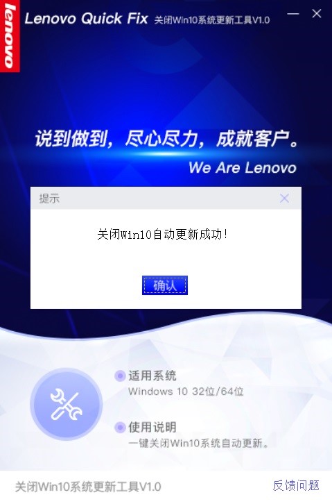 点击“关闭Win10系统自动更新”按钮,弹出提示,如图: