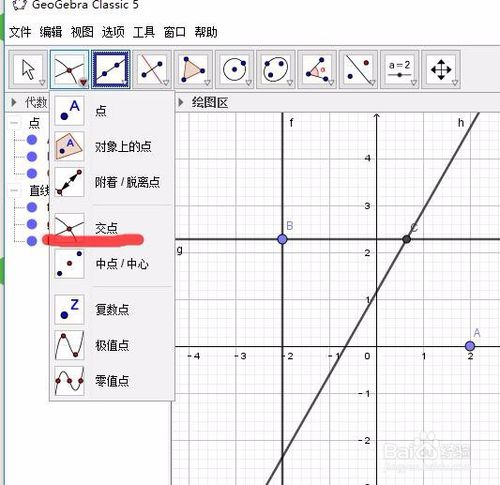 然后我们绘制出直线g与中垂线h的交点C,那么我们只要绘制出C点的轨迹,也就绘制出了抛物线。