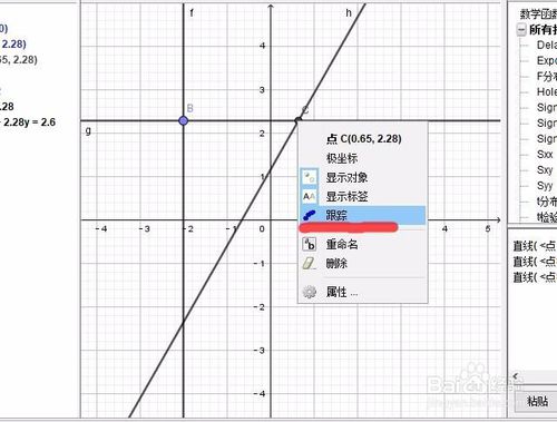 选中C点,右键点击跟踪,然后在直线f上滑动B点,即可看到粗糙的抛物线轨迹。