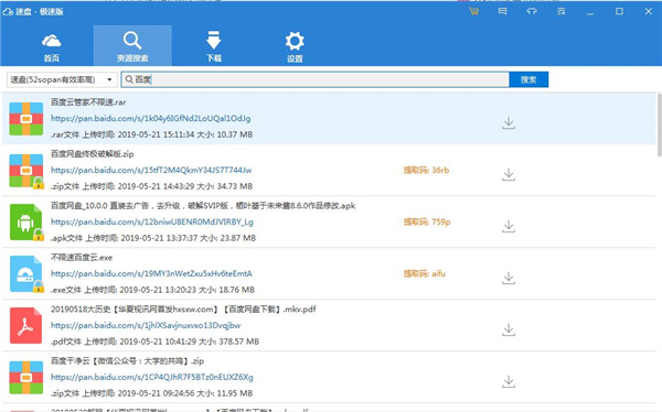 速盘极速版是一款非常好用的免登录极速度盘下载工具,此极速版可以帮助用户畅享极速下载度盘分享的资源,免受限速困扰,如果你不喜欢其他复杂的功能只想简单的进行网盘资源搜索和快速下载,使用这款速盘极速版可以满足你的所有需求,极速版速盘只包含资源搜索和资源高速下载两个功能。