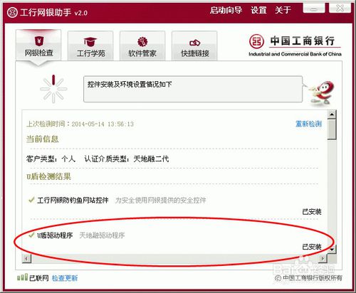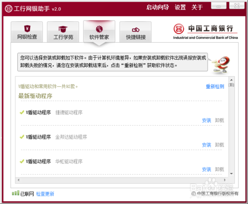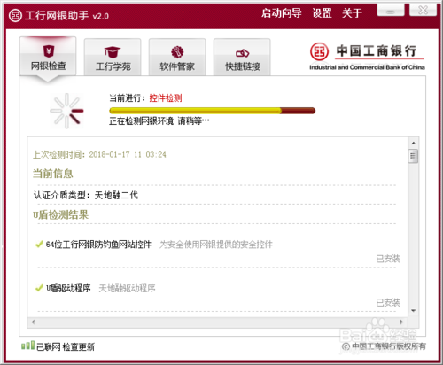 更加方便快捷:您可在工行门户网站下载工行网银助手,利用其引导功能,选择U盾类型后,助手会自动检测与该U盾相关的驱动程序、控件是否已经安装,如果未安装则会自动安装;如果已经安装但控件异常,则进行自动修复。