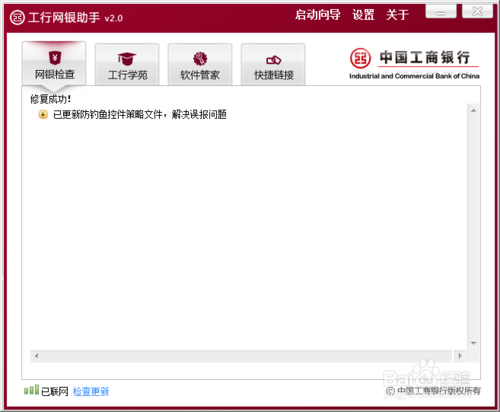 中国工商银行个人网上银行对于已经安装的软件,如果有新的版本,网银助手也将提醒您更新,以达到使用网银所需的最优环境配置。