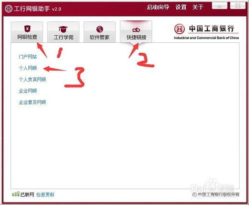 1、载安装好工行网银助手后,打开,由于经常使用都在任务栏中启动着。打开后一定要先检查一下更新,免得出现其他问题。然后点击快捷链接进入个人网银。