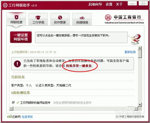 4、若工行网银还是打不开,单击“特殊异常一键修复”,如图: