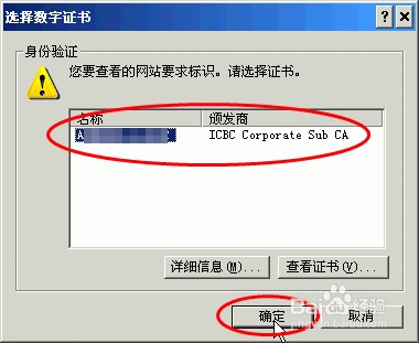 9、若成功检测到数字证书,单击“确定”,若不能检测到数字证书,请检查U盾是否正常连接,并用工行网银助手设置工行网银环境,确保成功安装U盾驱动及工行控件,如图: