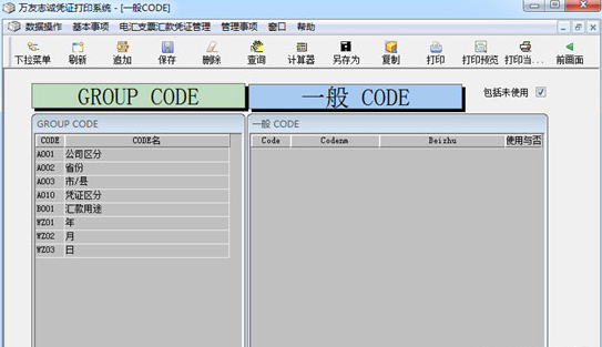 点击“查询”按钮,左边显示登记的内容,点击左边GROUP CODE栏,右边一般CODE栏显示该GROUP CODE 对应的一般CODE。此处不要随意添加、删除。