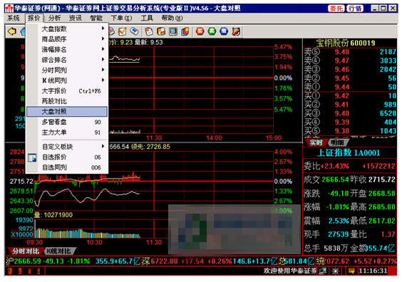 大盘对照页面同时显示某一商品的实时走势图与大盘指数的实时走势图。您可以通过点击“报价”菜单下的“大盘对照”选项调出该页面。