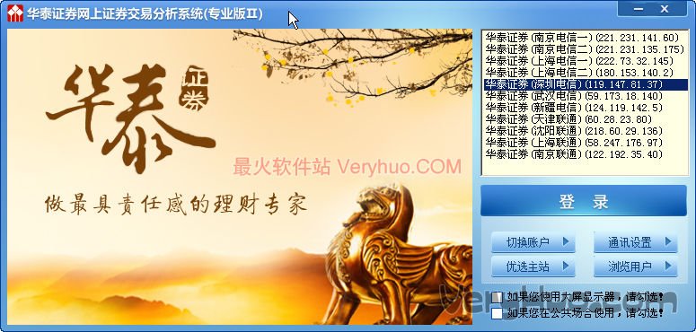 华泰证券专业版2是由华泰证券官方推出的电脑金融股票证券交易服务平台,让全国广大的额炒股用户可以在电脑上放心便捷炒股,玩转股票市场。华泰证券有着海量的实时股票行情资讯,每天都会更新最新的资讯内容,每天都能让用户在电脑上实时查看,一手了解最新的证券走势行情。华泰证券官方版有着专业的安全交易服务平台,采用了银行级别的安全密码服务认证,Aces256级动态密码,让你的账号更加的安全,网上享受最简单的股票交易。并且这款软件为你提供了海量的股票在线分析功能,专业的智能分析助手一站式帮你准确分析每一个股票上升与跌落,让你投资上更明确。