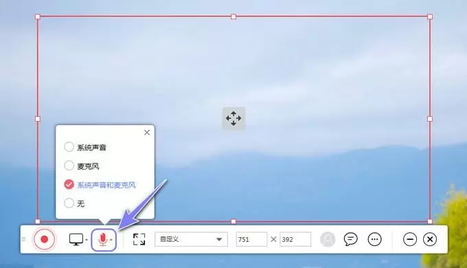 接下来,点击如图所示图标,选择音频选项:系统声音,麦克风或系统声音和麦克风。