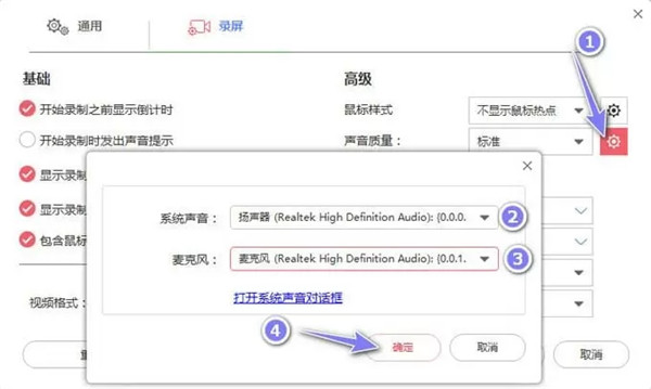 选择「声音质量」旁的设置图标,检查所选「系统声音」是否与您计算机上的默认系统声音以及所选的麦克风设备名称是否与您电脑插入的名称一致,保证完全一致后,点击「确定」。返回录制界面后,单击录制按钮开始录制。