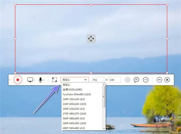 您也可以选择自定义区域录制,点击自定义下拉列表选项,或在「自定义」菜单旁输入录制区域分辨率。