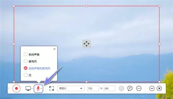 正如如何录制视频第一步一样,在页面上点击「开始录制」,启动录制。接下来,点击如图所示图标,选择音频选项:系统声音,麦克风或系统声音和麦克风。