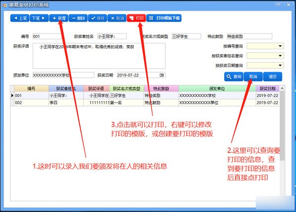 简易奖状打印系统是一款奖状或荣誉证自定义打印软件,可设计可修改纸张尺寸无限制,支持批量录入要打印的数据,可以自由调整打印位置,可以自定义打印纸大小,可以随意新建打印模版并保存!【简易奖状打印系统免费版功能介绍】