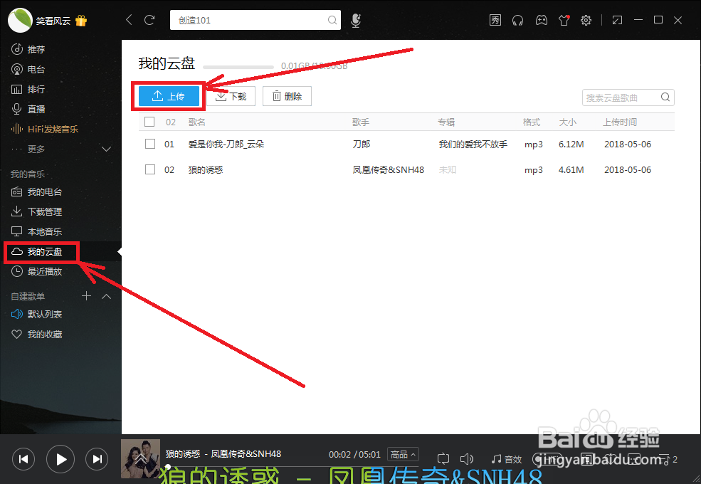 接下来打开左边的我云盘,把下载好的歌曲上传到云盘,如下图: