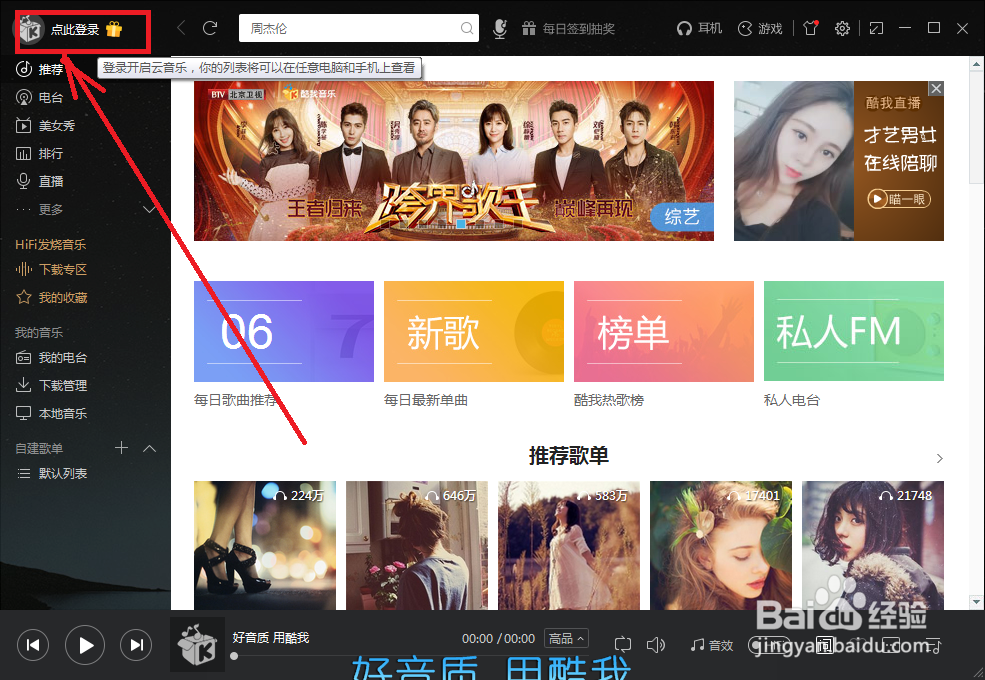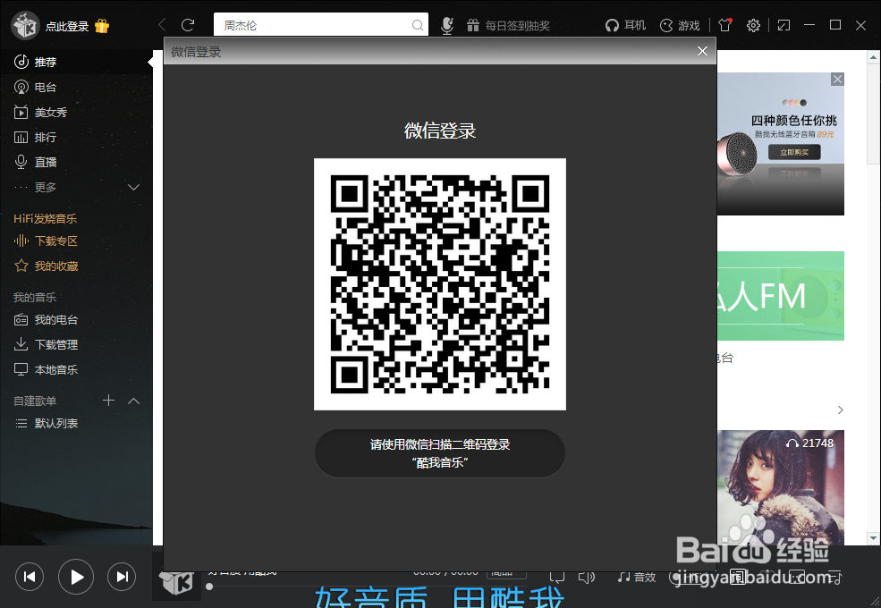 首先,我们在电脑上、手机上都安装好最新版的酷我音乐,然后用同一帐号登录到酷我音乐。如下图我们用微信扫码登录,用微信帐号作为酷我音乐的登录帐号,免去注册的麻烦。