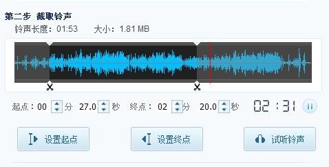 然后软件会自动地播放音乐,在第二步的右下角有个“开始/暂停”的按钮,可以随时开始或暂停音乐,在音乐播放时,会看见有条竖直亮线在移动,可以根据自己的需要,在需要剪切的地方单击,就会出现小剪刀的图形;
